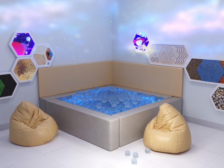 Сухой бассейн с шариками – это универсальное оснащение для сенсорной комнаты, в нём можно как играть и веселиться, так и расслабляться под тихую, спокойную музыку, чувствуя успокаивающее давление шариков на кожу. Подходит для активационной и релаксационной практики.
